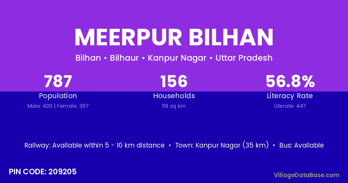 Kanpur Nagar (35 km) is the nearest town to Meerpur Bilhan village for major economic activities and is located approximately 35 km away.