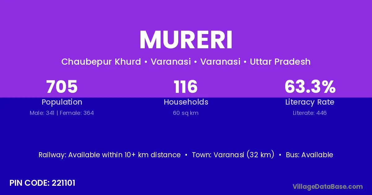 The literacy rate of Mureri village is 72.20%. Male literacy stands at 79.53% and female literacy at 65.15%.