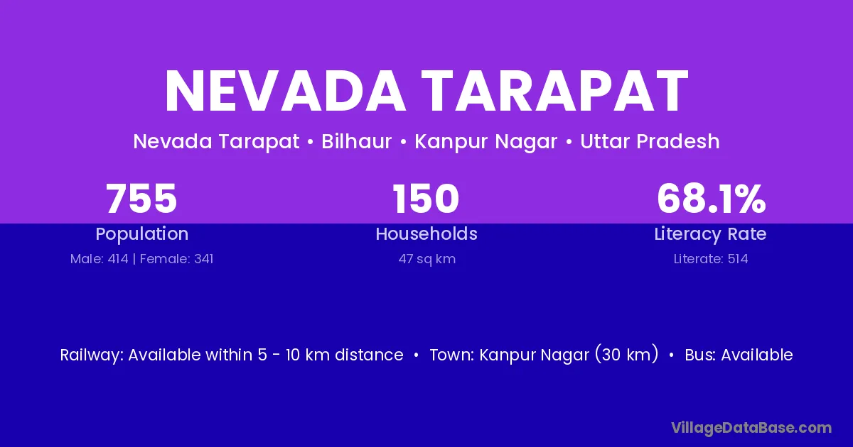 Kanpur Nagar (30 km) is the nearest town to Nevada Tarapat village for major economic activities and is located approximately 30 km away.