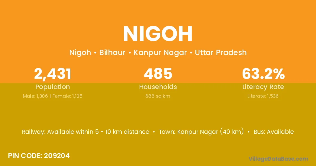 Kanpur Nagar (40 km) is the nearest town to Nigoh village for major economic activities and is located approximately 40 km away.