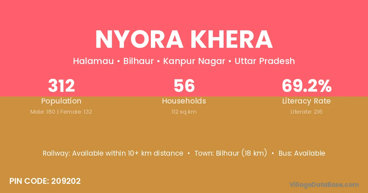 Bilhaur (18 km) is the nearest town to Nyora Khera village for major economic activities and is located approximately 18 km away.