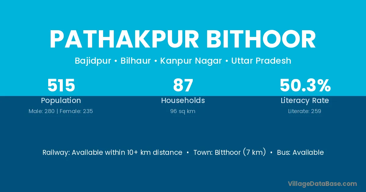 Pathakpur Bithoor village has a total population of 515 people, of which 280 are males and 235 are females.
