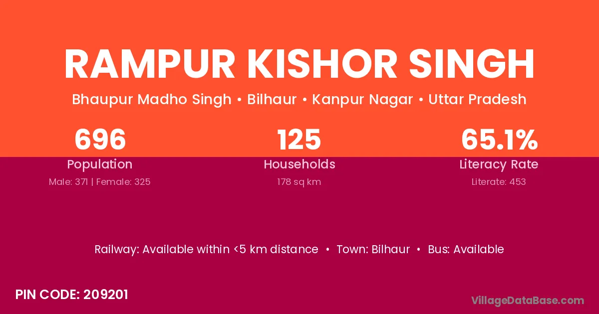 Rampur Kishor Singh village has a total population of 696 people, of which 371 are males and 325 are females.