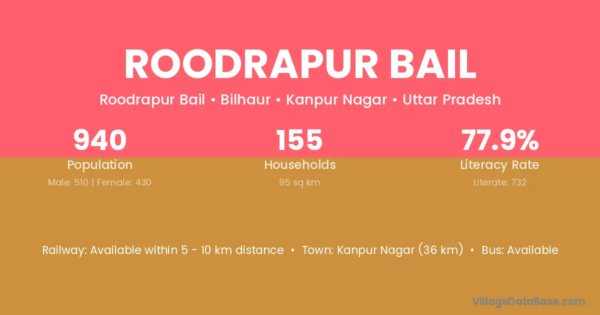 Kanpur Nagar (36 km) is the nearest town to Roodrapur Bail village for major economic activities and is located approximately 36 km away.