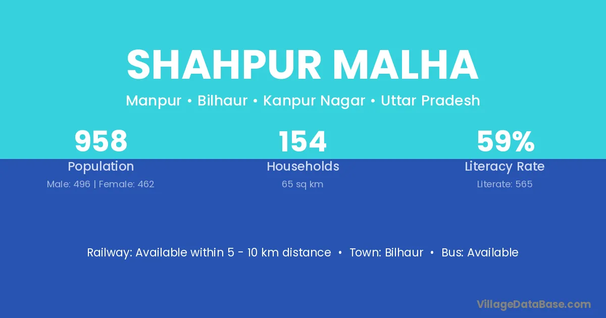 Shahpur Malha village has a total population of 958 people, of which 496 are males and 462 are females.