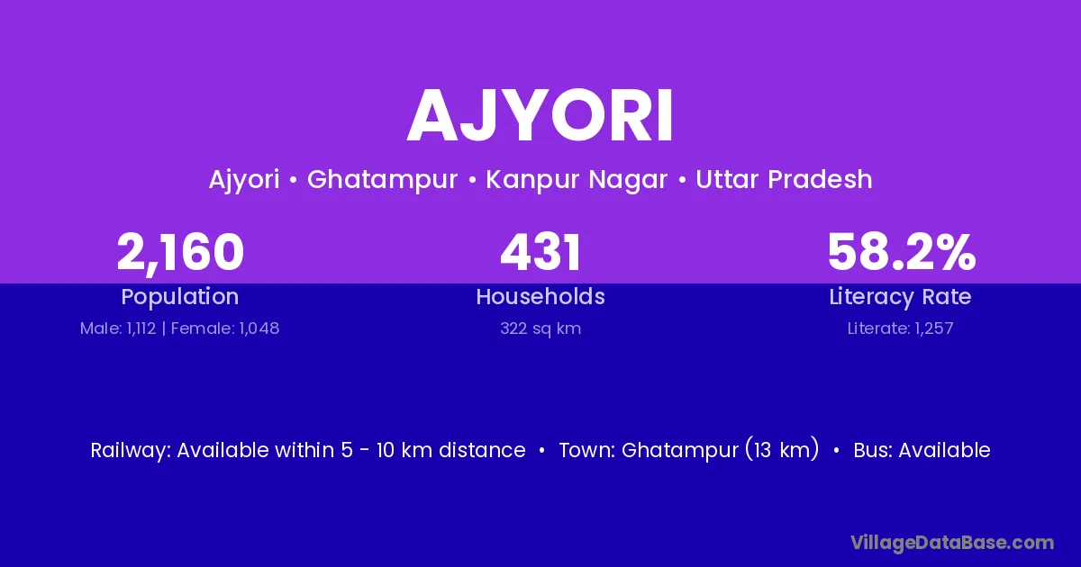 Ghatampur (13 km) is the nearest town to Ajyori village for major economic activities and is located approximately 13 km away.