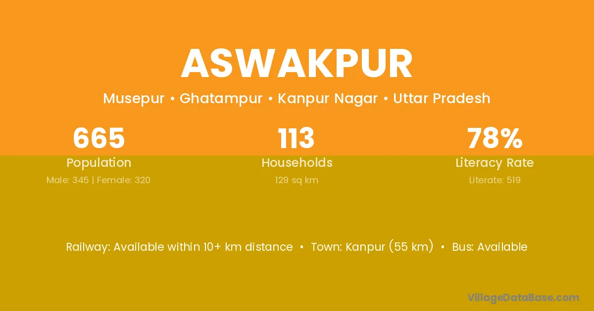 Kanpur (55 km) is the nearest town to Aswakpur village for major economic activities and is located approximately 55 km away.
