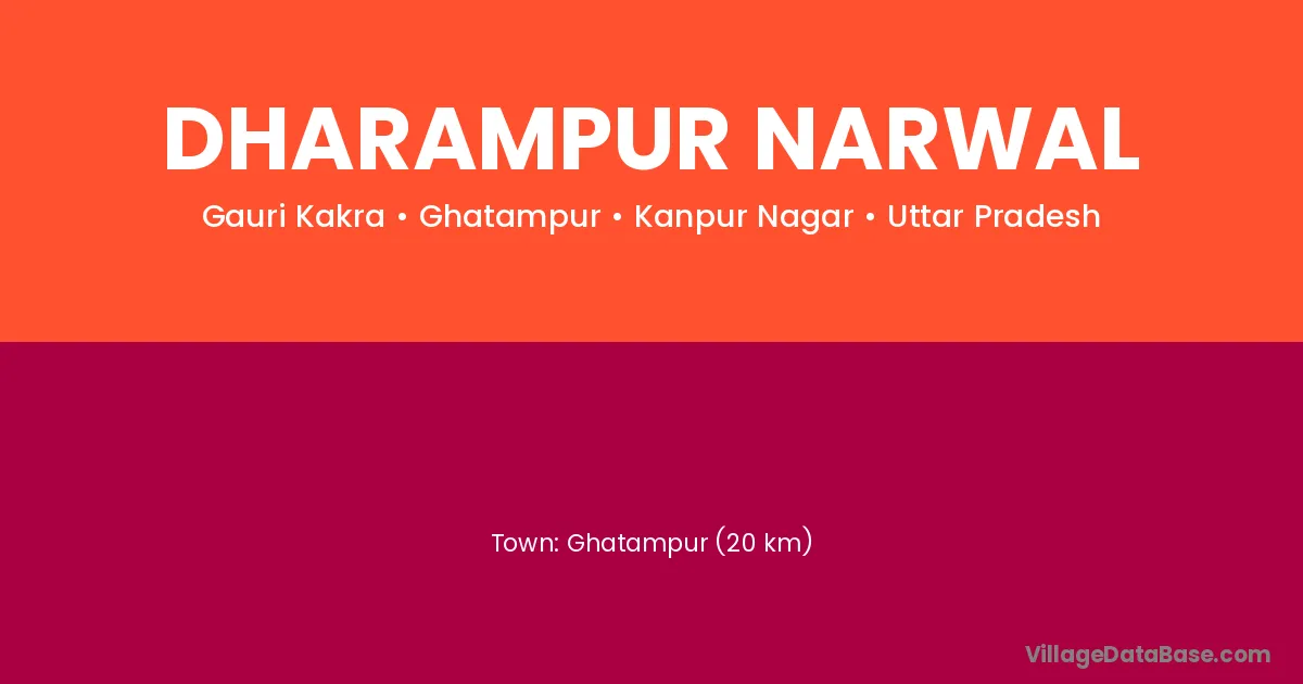 Ghatampur (20 km) is the nearest town to Dharampur Narwal village for major economic activities and is located approximately 20 km away.