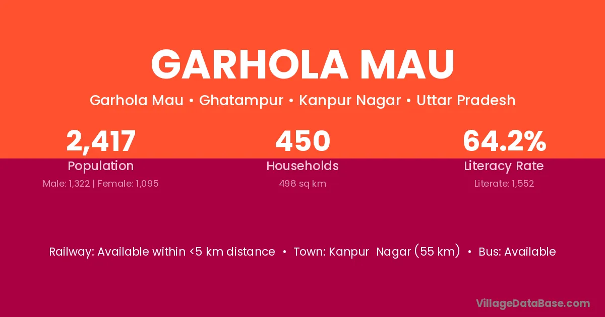 Kanpur Nagar (55 km) is the nearest town to Garhola Mau village for major economic activities and is located approximately 55 km away.