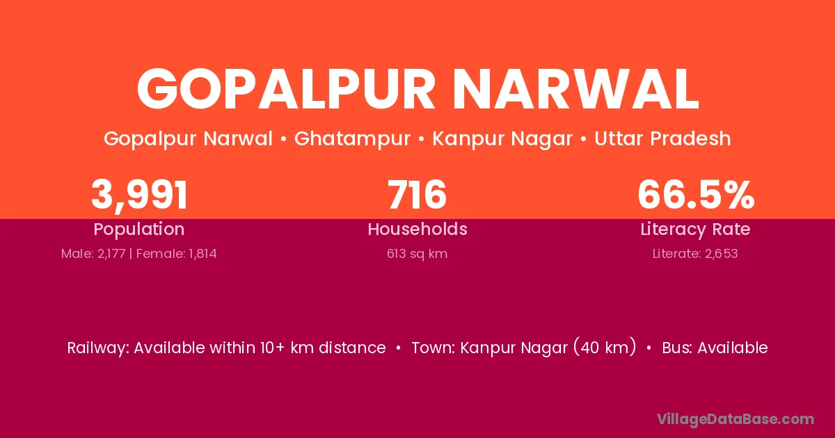 Kanpur Nagar (40 km) is the nearest town to Gopalpur Narwal village for major economic activities and is located approximately 40 km away.