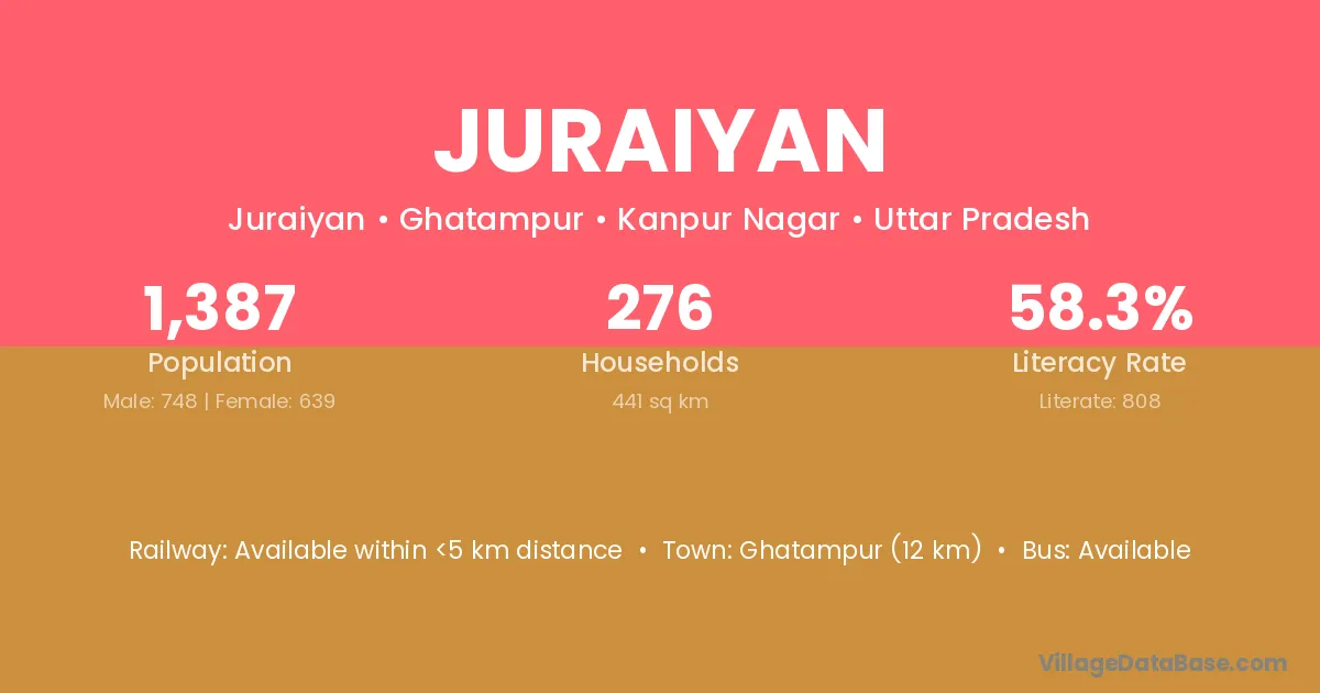 Ghatampur (12 km) is the nearest town to Juraiyan village for major economic activities and is located approximately 12 km away.