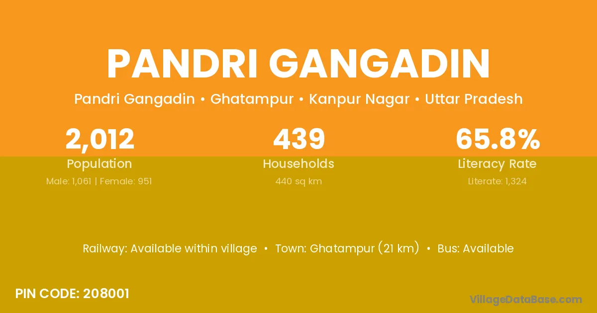Ghatampur (21 km) is the nearest town to Pandri Gangadin village for major economic activities and is located approximately 21 km away.