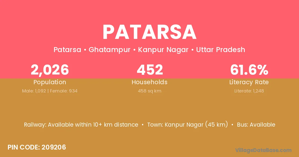 Kanpur Nagar (45 km) is the nearest town to Patarsa village for major economic activities and is located approximately 45 km away.