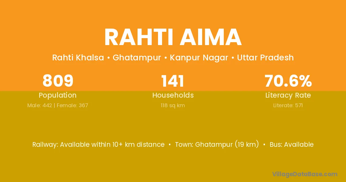 Ghatampur (19 km) is the nearest town to Rahti Aima village for major economic activities and is located approximately 19 km away.
