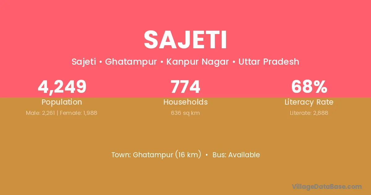 Ghatampur (16 km) is the nearest town to Sajeti village for major economic activities and is located approximately 16 km away.