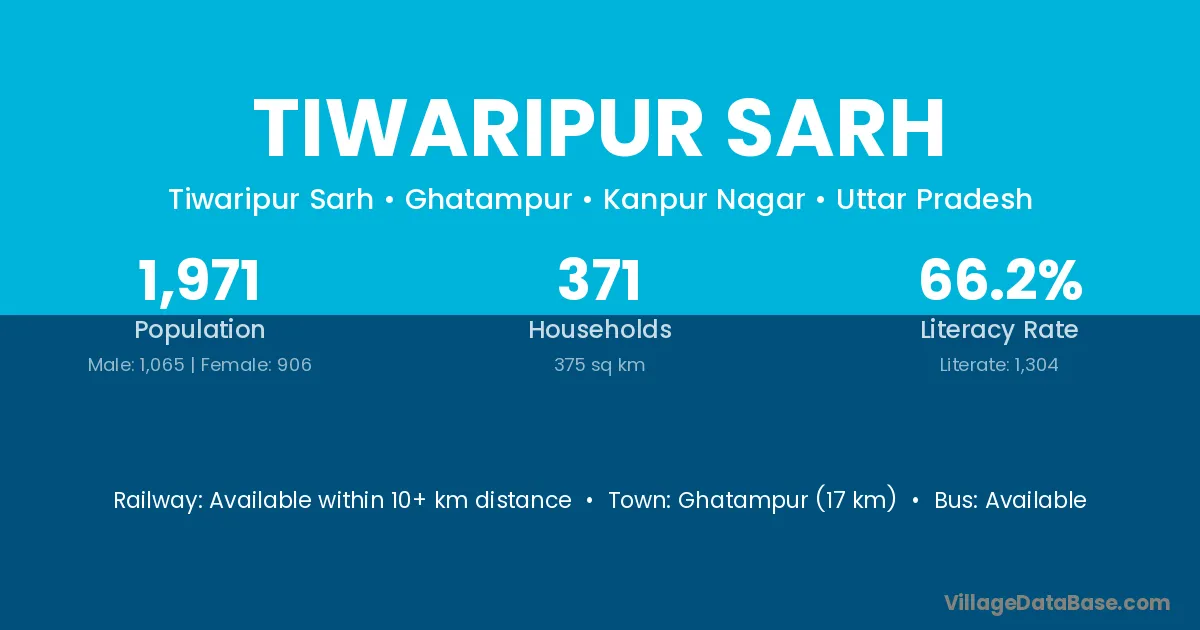 Ghatampur (17 km) is the nearest town to Tiwaripur Sarh village for major economic activities and is located approximately 17 km away.