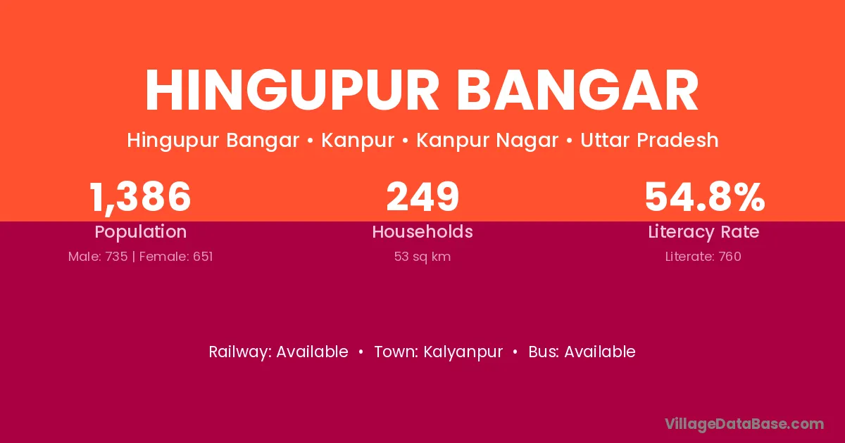 Hingupur Bangar village has a total population of 1,386 people, of which 735 are males and 651 are females.