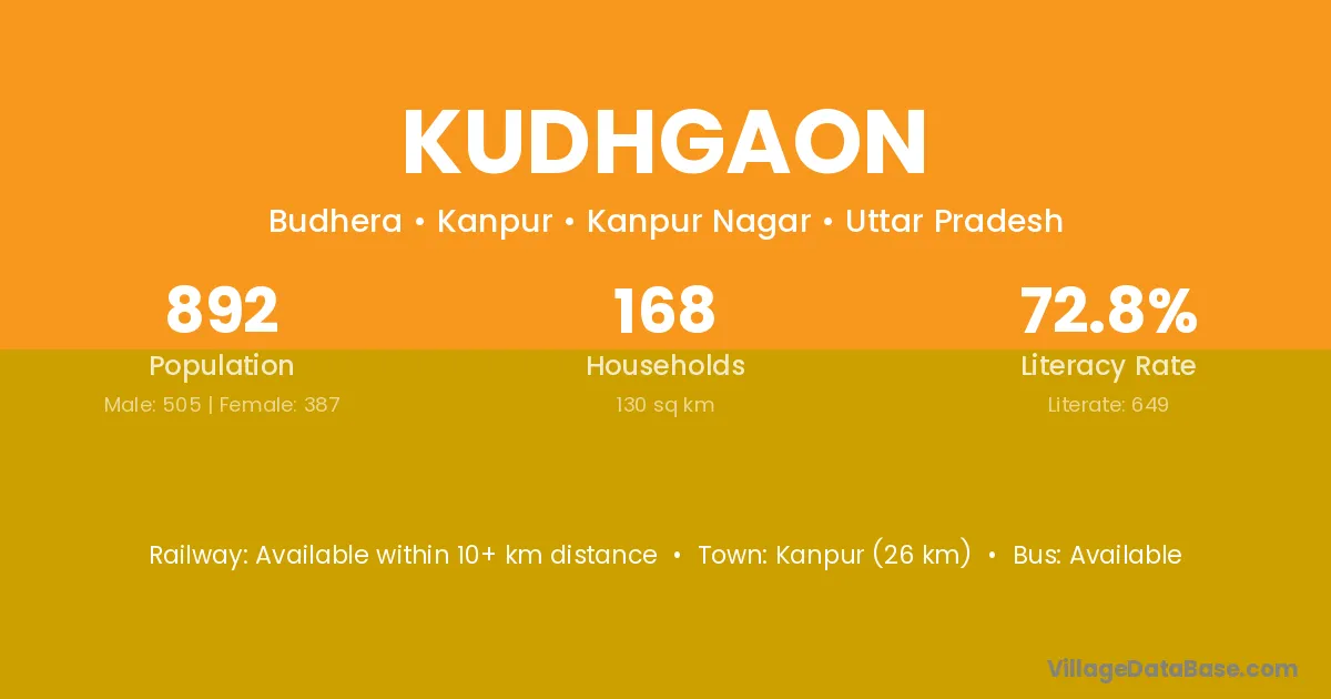 Kudhgaon village has a total population of 892 people, of which 505 are males and 387 are females.