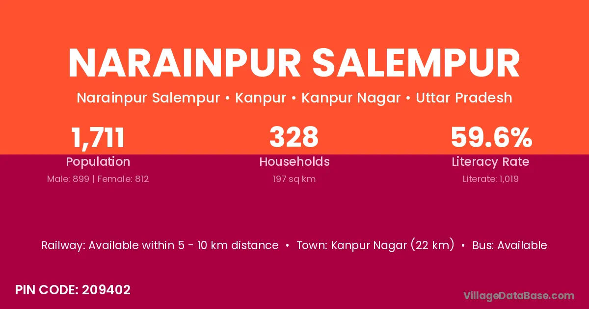 Kanpur Nagar (22 km) is the nearest town to Narainpur Salempur village for major economic activities and is located approximately 22 km away.