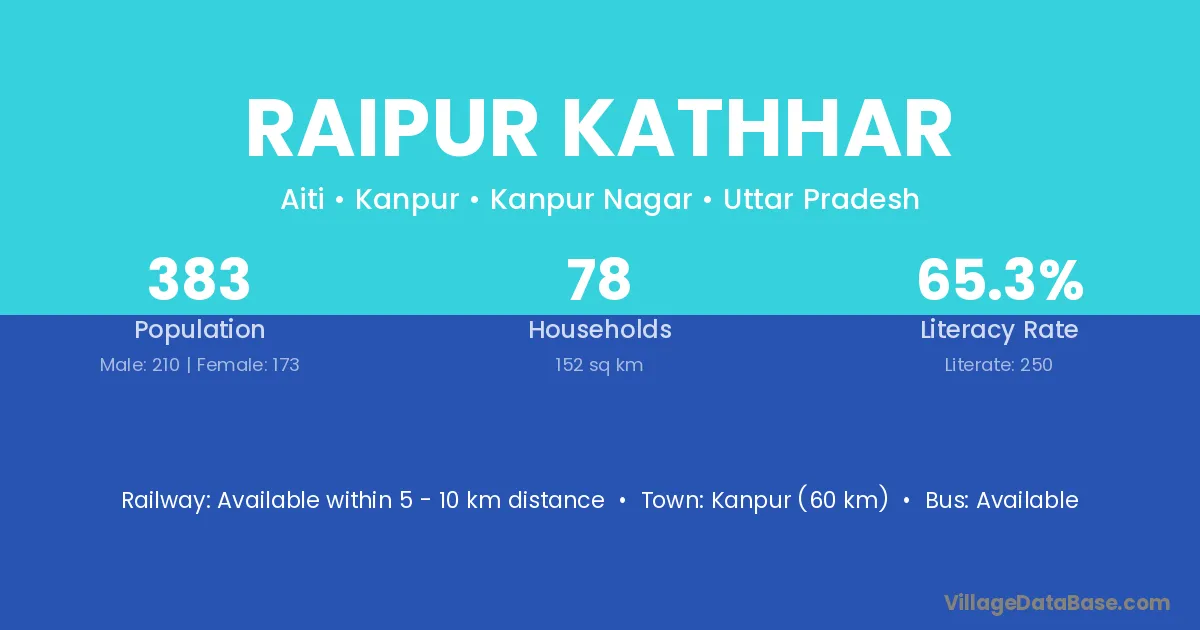 Kanpur (60 km) is the nearest town to Raipur Kathhar village for major economic activities and is located approximately 60 km away.