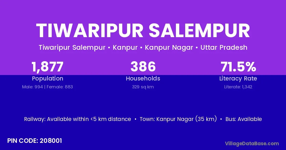 Kanpur Nagar (35 km) is the nearest town to Tiwaripur Salempur village for major economic activities and is located approximately 35 km away.