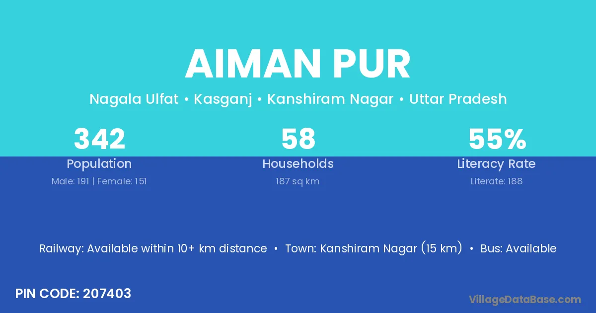 Kanshiram Nagar (15 km) is the nearest town to Aiman Pur village for major economic activities and is located approximately 15 km away.