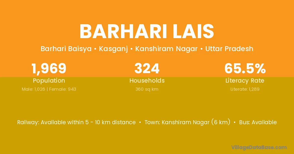 Kanshiram Nagar (6 km) is the nearest town to Barhari Lais village for major economic activities and is located approximately 6 km away.