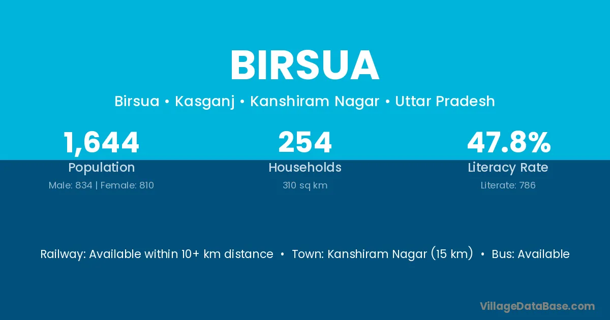 Kanshiram Nagar (15 km) is the nearest town to Birsua village for major economic activities and is located approximately 15 km away.