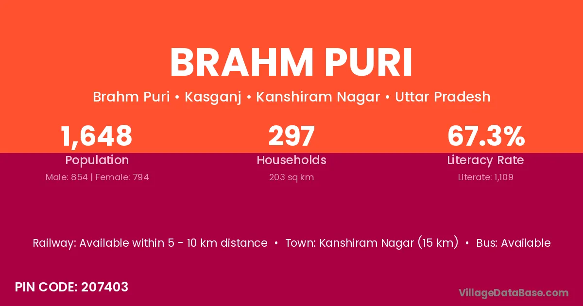 Kanshiram Nagar (15 km) is the nearest town to Brahm Puri village for major economic activities and is located approximately 15 km away.