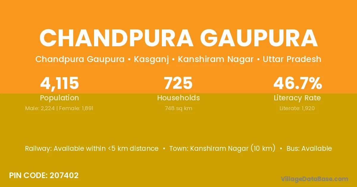 Kanshiram Nagar (10 km) is the nearest town to Chandpura Gaupura village for major economic activities and is located approximately 10 km away.