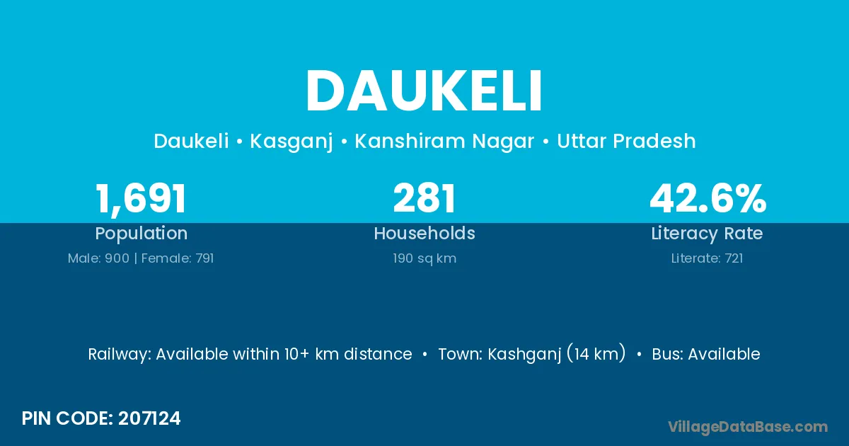 Kashganj (14 km) is the nearest town to Daukeli village for major economic activities and is located approximately 14 km away.