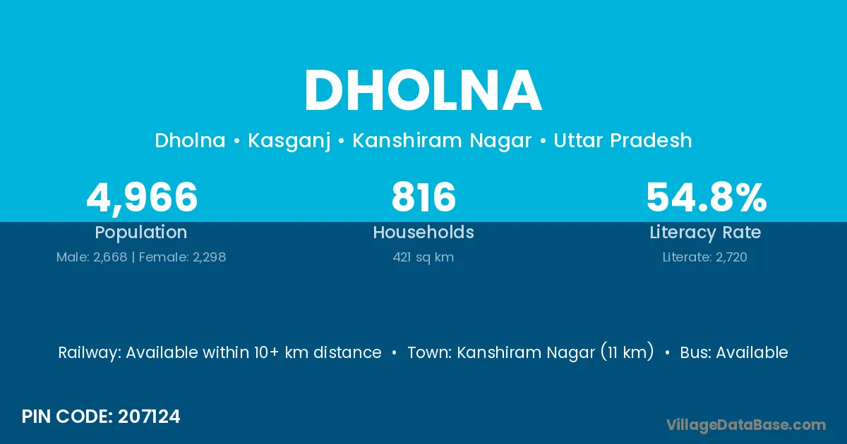 Kanshiram Nagar (11 km) is the nearest town to Dholna village for major economic activities and is located approximately 11 km away.