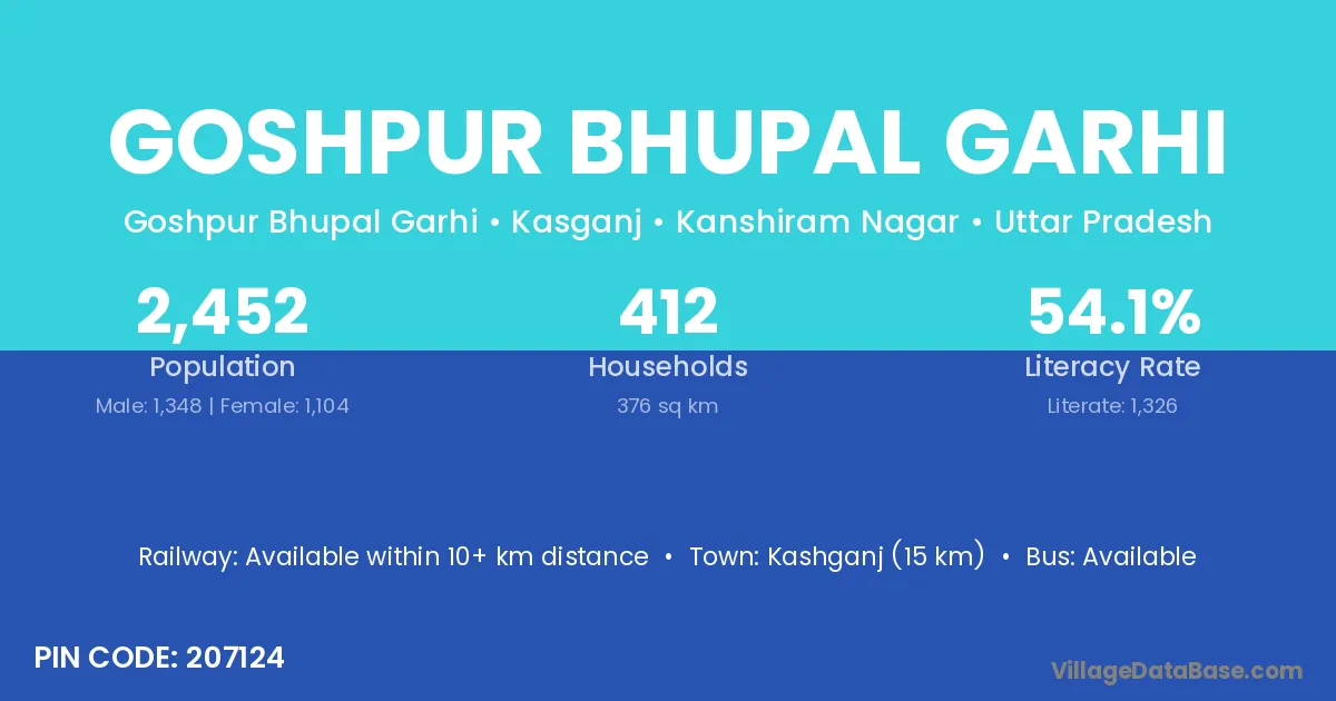 Kashganj (15 km) is the nearest town to Goshpur Bhupal Garhi village for major economic activities and is located approximately 15 km away.