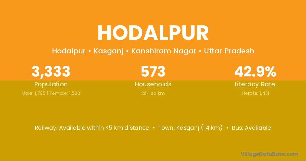 Kasganj (14 km) is the nearest town to Hodalpur village for major economic activities and is located approximately 14 km away.