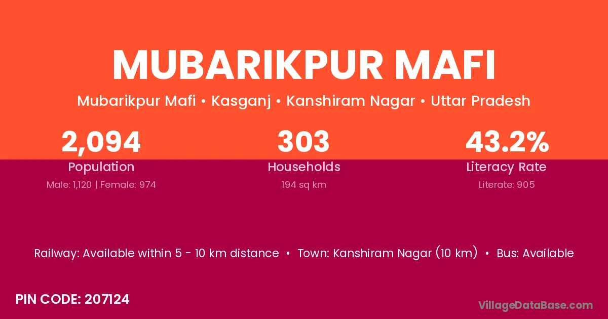 Kanshiram Nagar (10 km) is the nearest town to Mubarikpur Mafi village for major economic activities and is located approximately 10 km away.