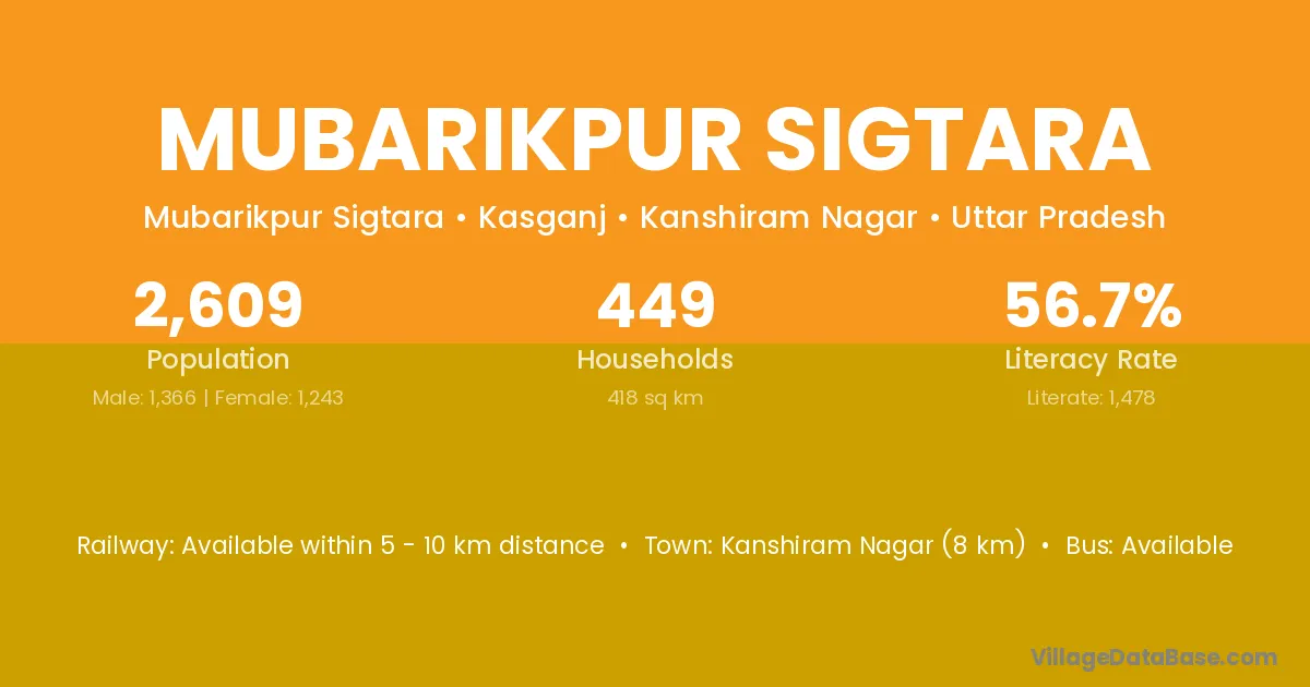 Kanshiram Nagar (8 km) is the nearest town to Mubarikpur Sigtara village for major economic activities and is located approximately 8 km away.