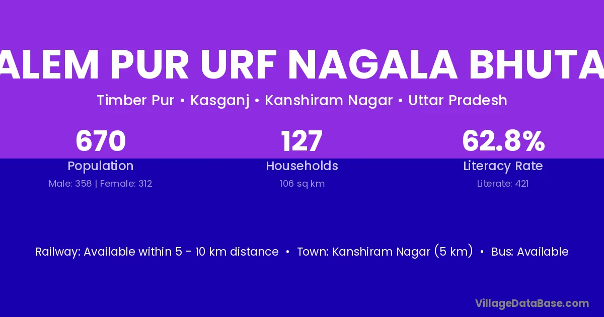 Kanshiram Nagar (5 km) is the nearest town to Salem Pur Urf Nagala Bhutan village for major economic activities and is located approximately 5 km away.