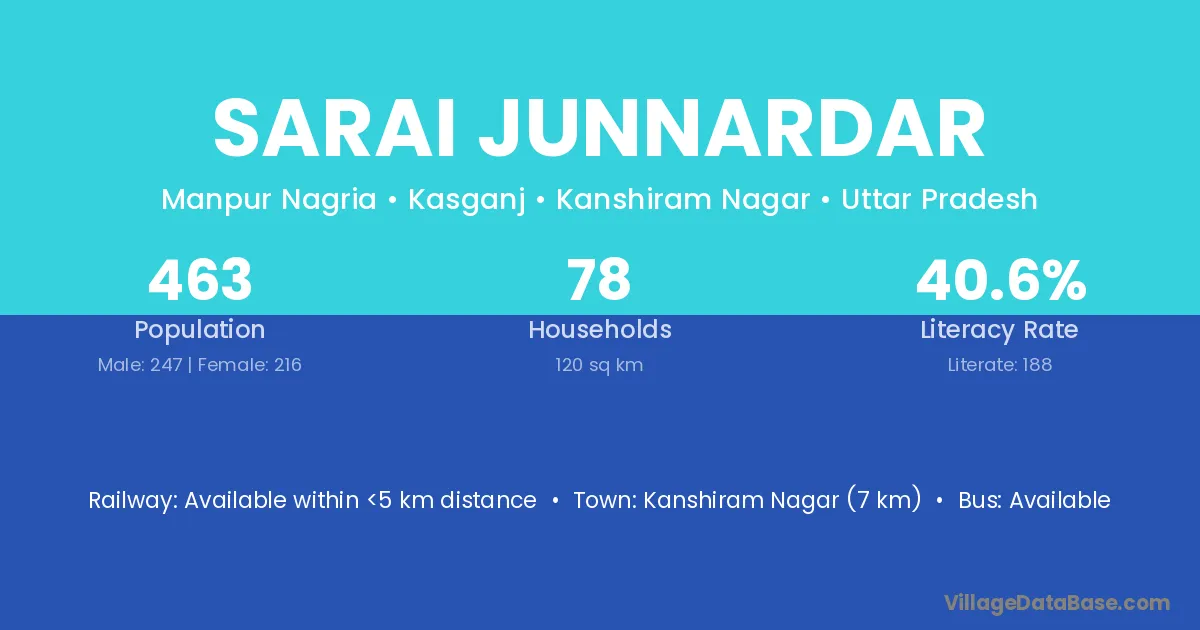 Kanshiram Nagar (7 km) is the nearest town to Sarai Junnardar village for major economic activities and is located approximately 7 km away.