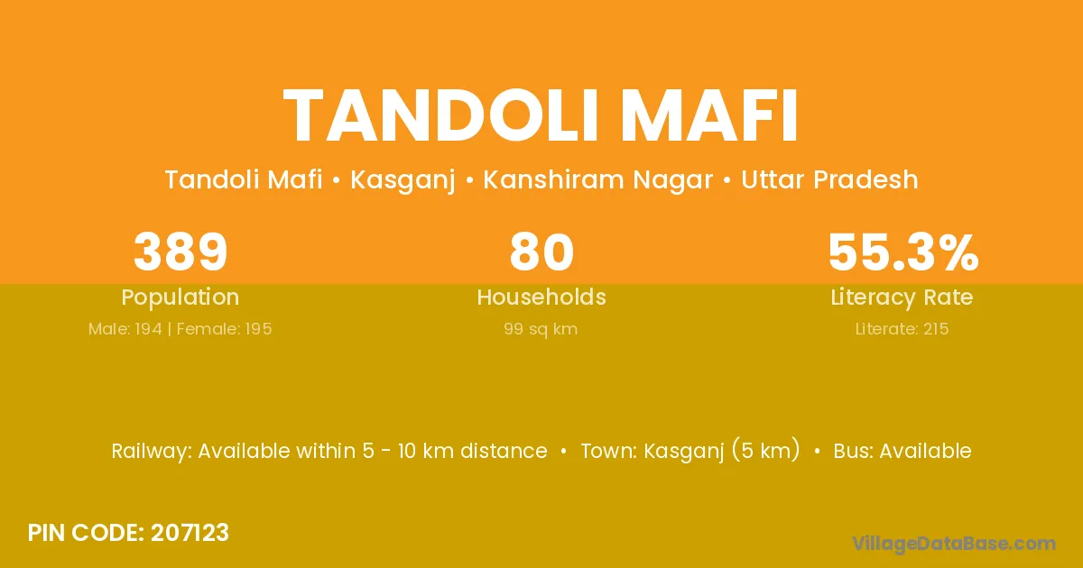 Kasganj (5 km) is the nearest town to Tandoli Mafi village for major economic activities and is located approximately 5 km away.