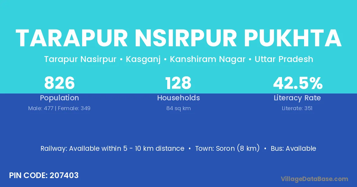 Soron (8 km) is the nearest town to Tarapur Nsirpur Pukhta village for major economic activities and is located approximately 8 km away.