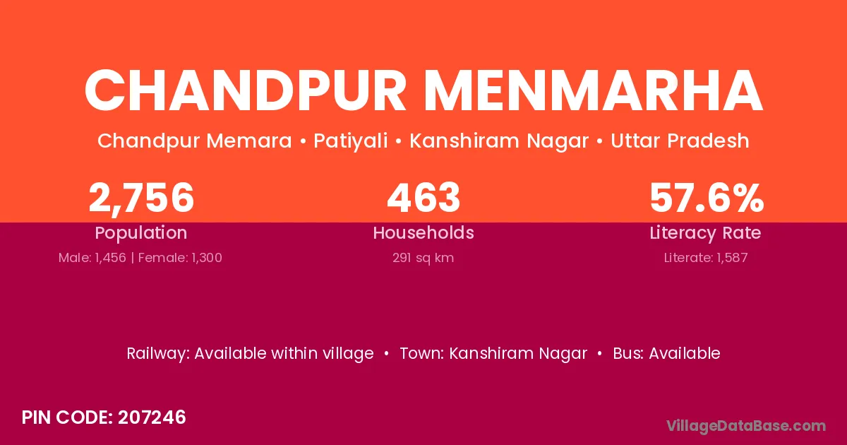 Chandpur Menmarha village has a total population of 2,756 people, of which 1,456 are males and 1,300 are females.