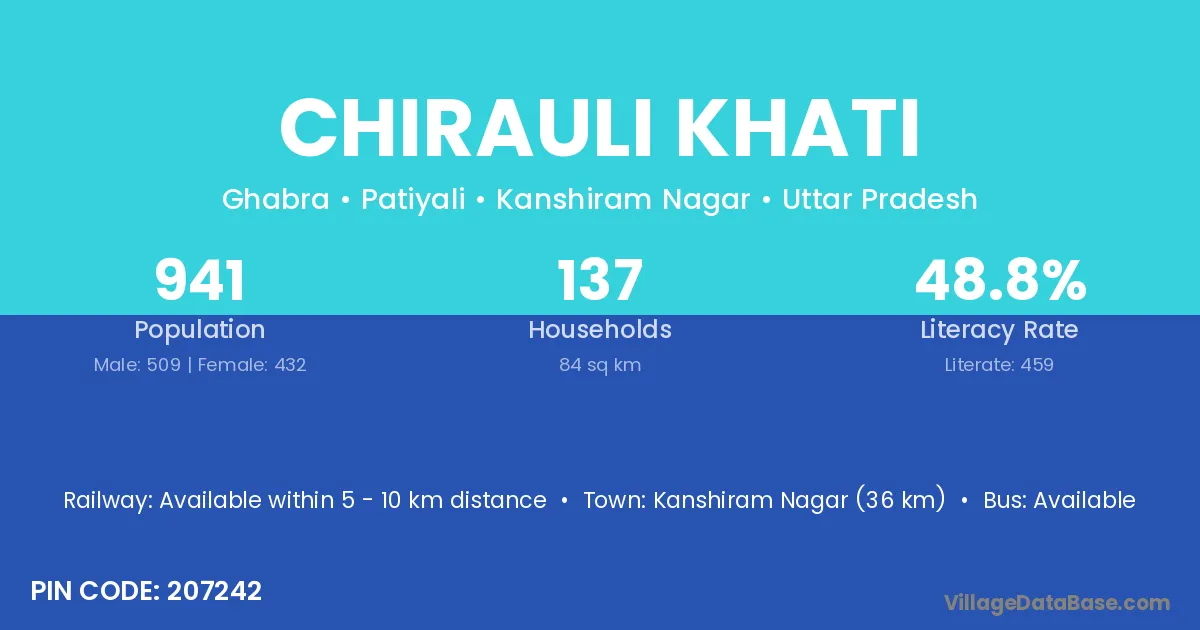 Chirauli Khati village has a total population of 941 people, of which 509 are males and 432 are females.