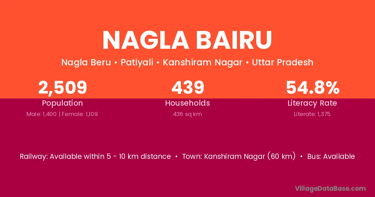 Kanshiram Nagar (60 km) is the nearest town to Nagla Bairu village for major economic activities and is located approximately 60 km away.