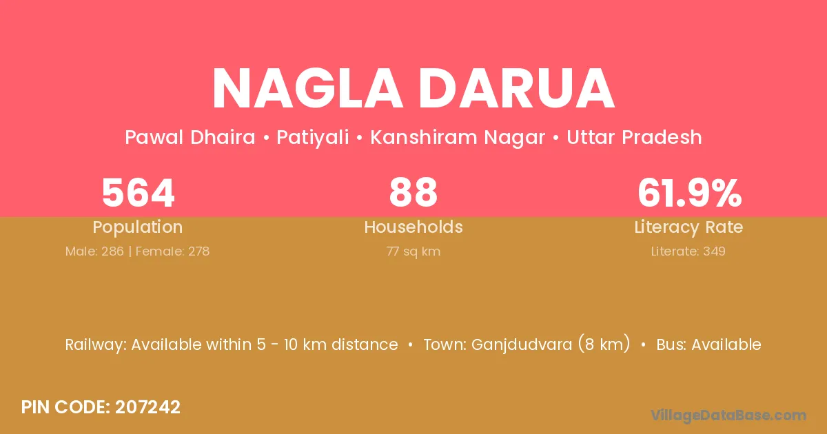 Ganjdudvara (8 km) is the nearest town to Nagla Darua village for major economic activities and is located approximately 8 km away.