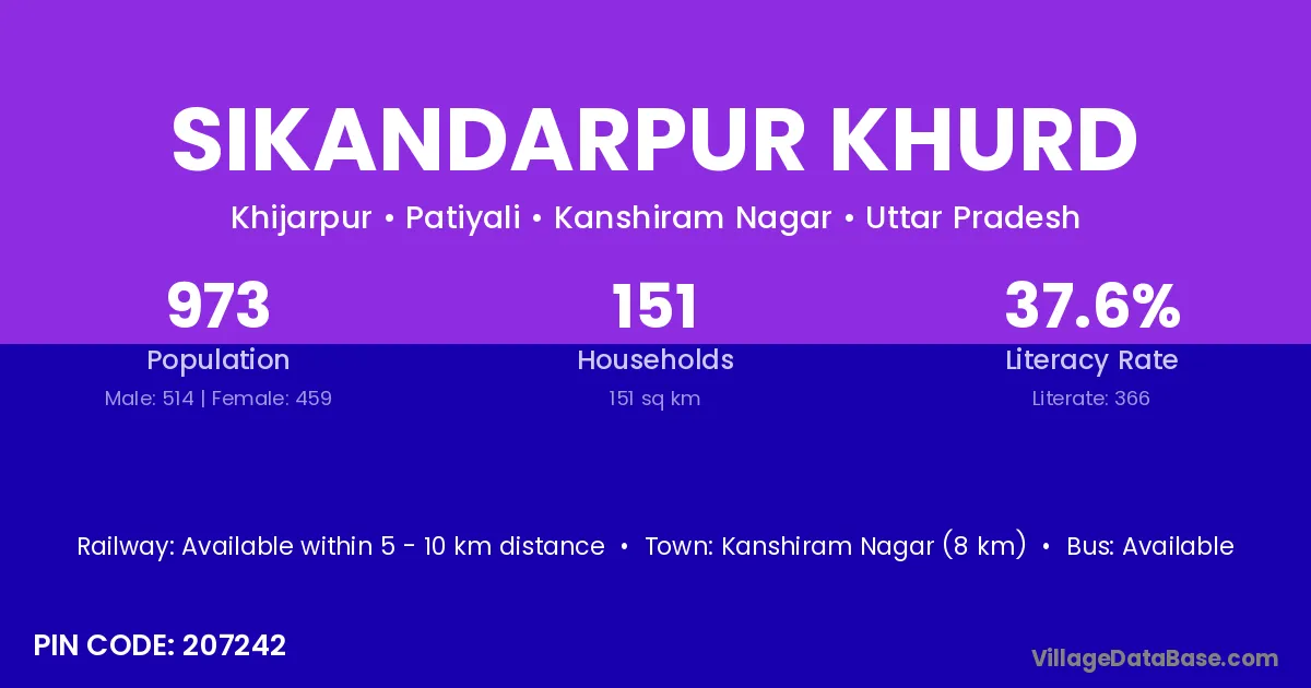 Kanshiram Nagar (8 km) is the nearest town to Sikandarpur Khurd village for major economic activities and is located approximately 8 km away.