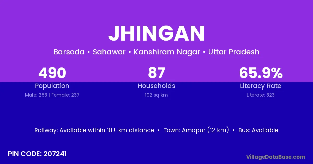 Jhingan village has a total population of 490 people, of which 253 are males and 237 are females.