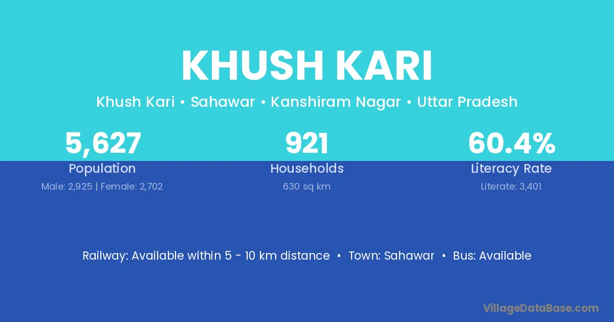 Khush Kari village has a total population of 5,627 people, of which 2,925 are males and 2,702 are females.