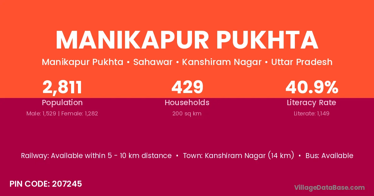 Kanshiram Nagar (14 km) is the nearest town to Manikapur Pukhta village for major economic activities and is located approximately 14 km away.