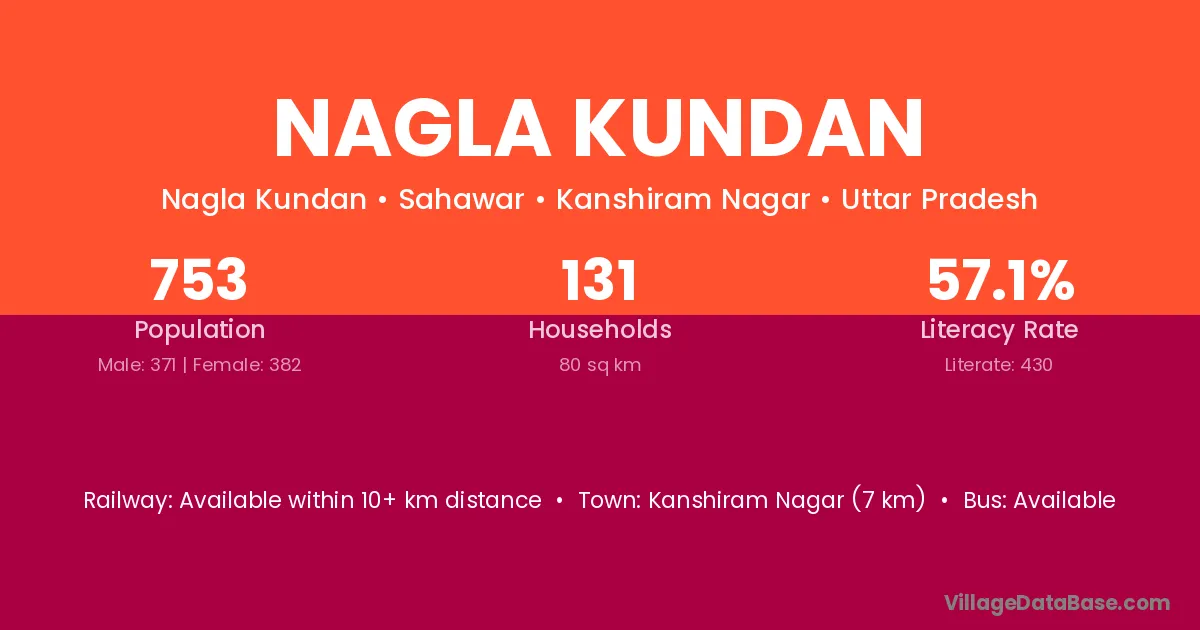 Kanshiram Nagar (7 km) is the nearest town to Nagla Kundan village for major economic activities and is located approximately 7 km away.