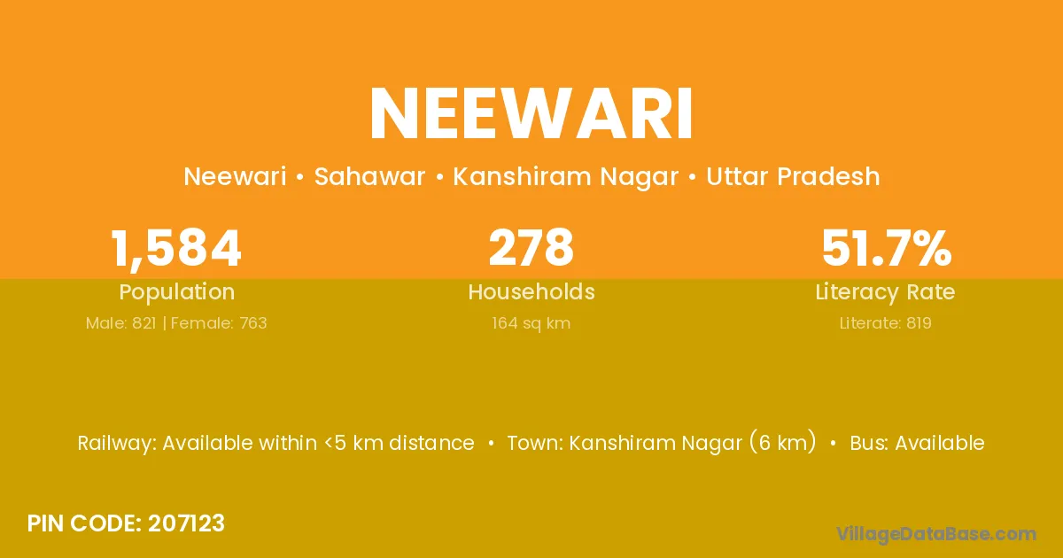Kanshiram Nagar (6 km) is the nearest town to Neewari village for major economic activities and is located approximately 6 km away.